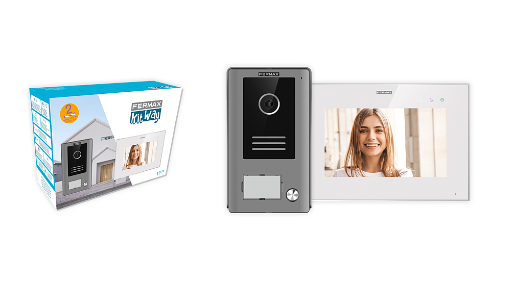 Kit vidéo 1 bouton comprenant une platine de rue saillie WAY réf. 1527 et un écran tactile mains libres WAY 7" réf. 1525. Installation 2 fils non polarisés. Capture automatique ou manuelle de photos et vidéos. Kit préprogrammé Plug & Play.