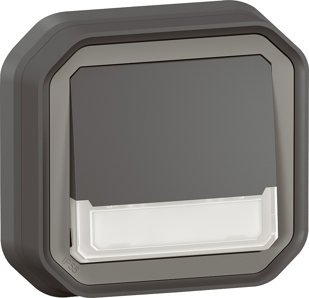 Poussoir NO lumineux étanche Plexo 10A IP55 IK08 à équiper de support plaque ou boîtier saillie, livré avec voyant 230V et enjoliveur anthracite