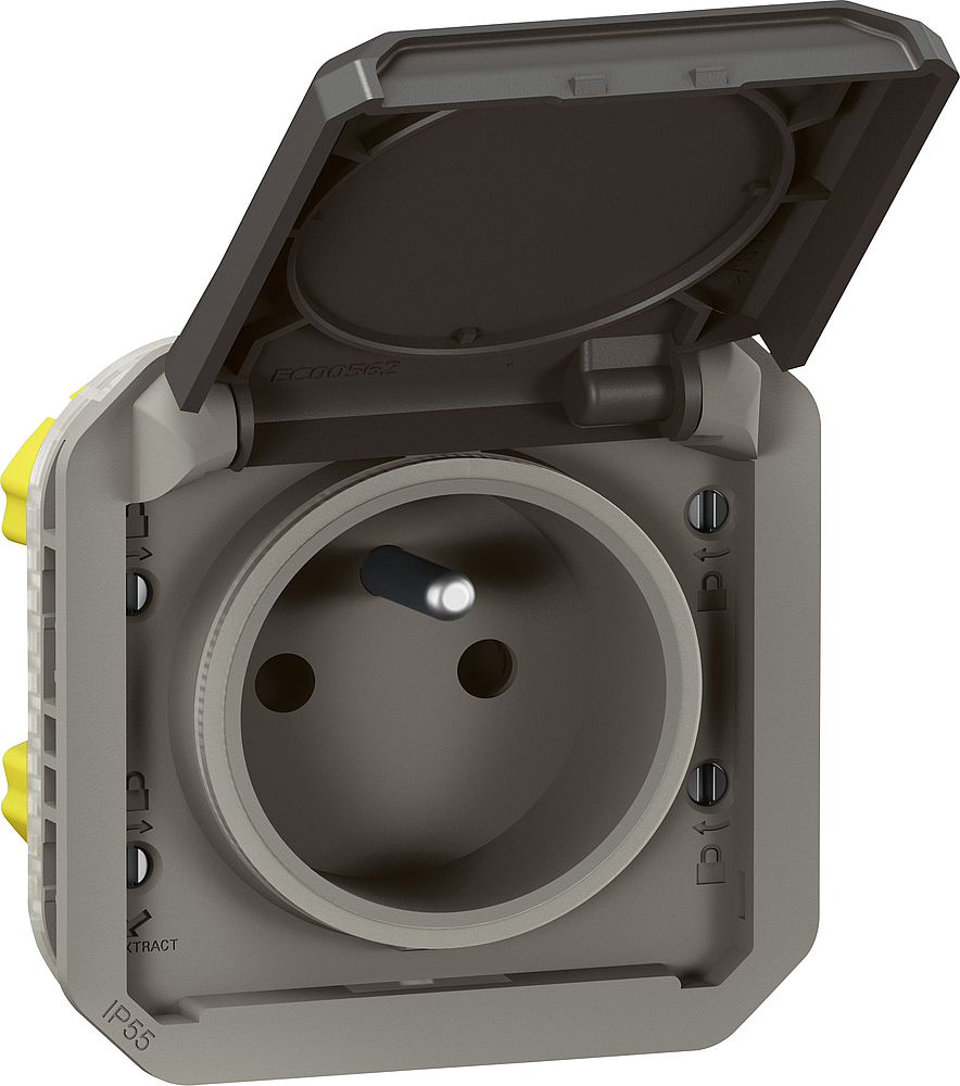 Prise de courant 2P+T étanche Plexo 16A 250V IP55 IK08 à équiper de support plaque ou boîtier saillie, avec enjoliveur anthracite