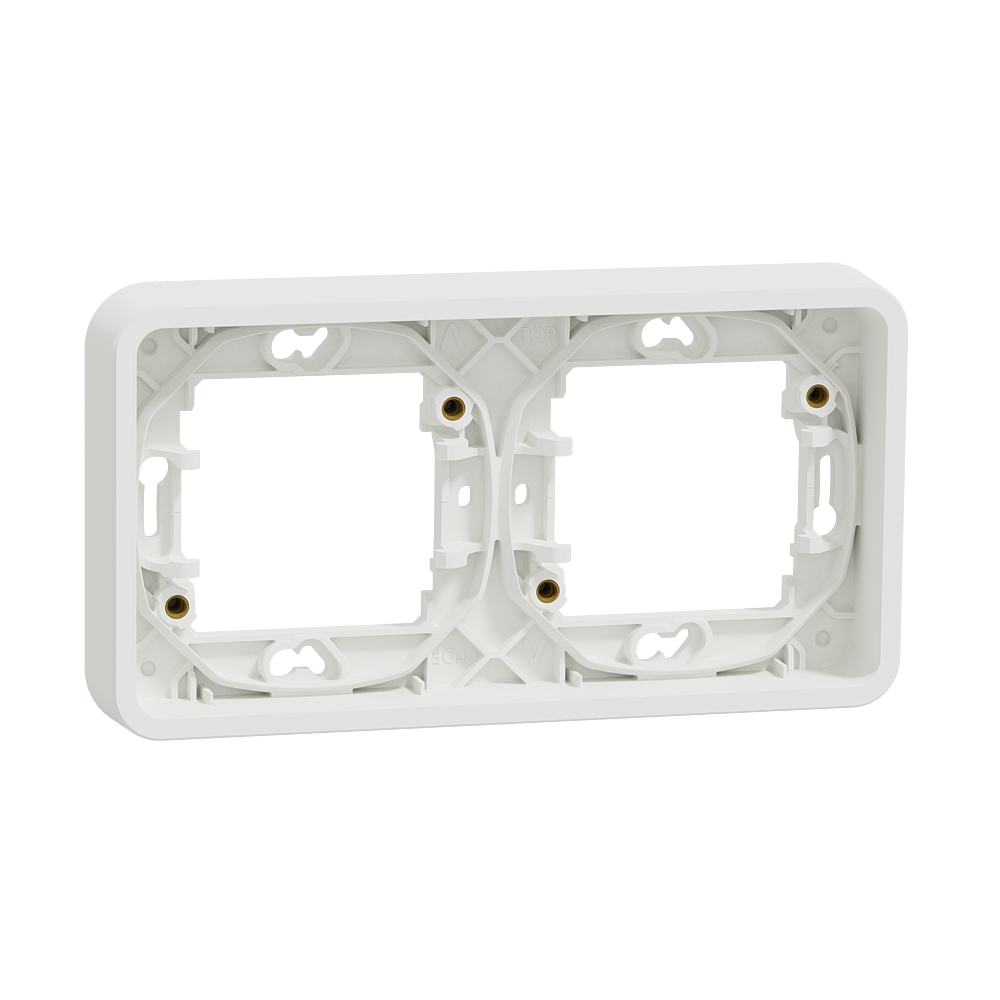 Mureva Styl - cadre pour montage encastré - 2 postes horizontal - entraxe 71 x blanc RAL 9003 fixation par vis - auto-extinguible - Utilisation intérieur/extérieur - Dim. en saillie (mm) 84 x 155 x 19 - NF - IP55 - IK08 - Vente par 1