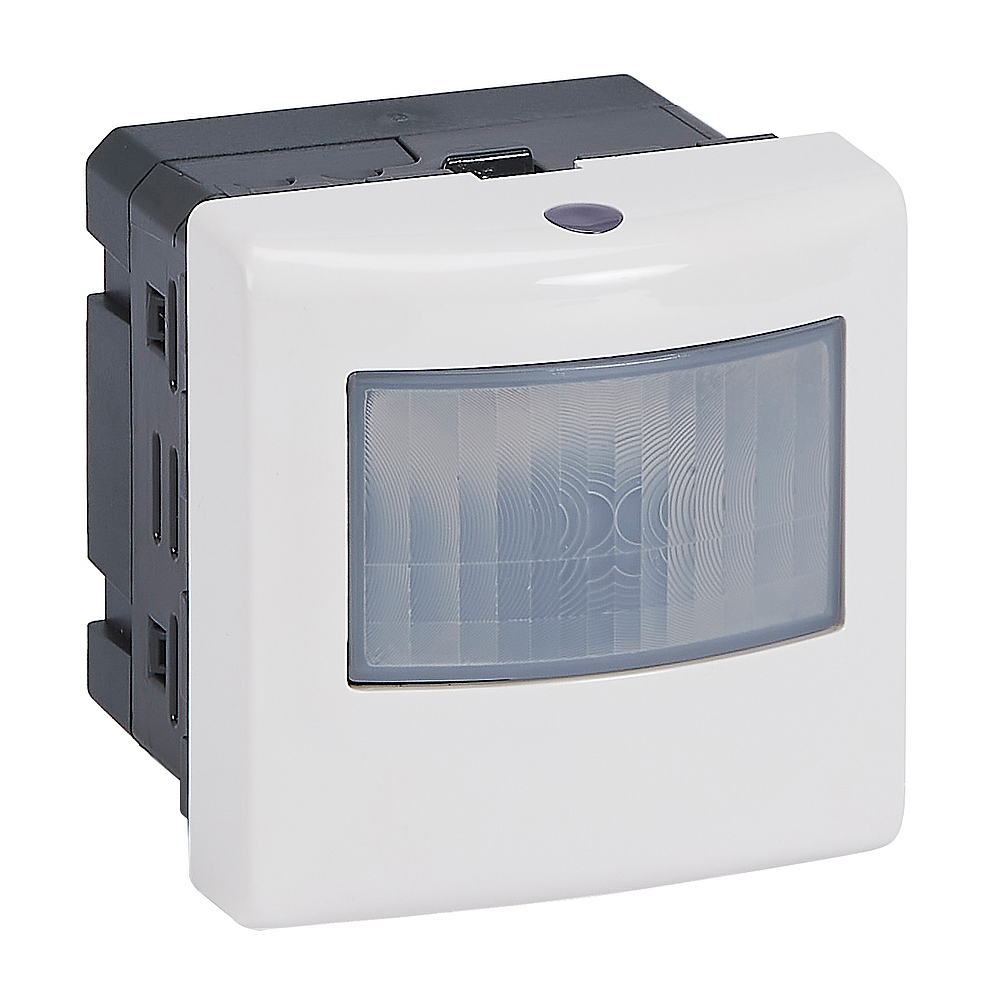Détecteur mural universel Mosaic à détection infrarouge, compatible toutes lampes et jusqu'à 100W LED, câblage 2 fils sans Neutre - 2 modules blanc RAL9003 finition brillante - à équiper de support et plaque Mosaic