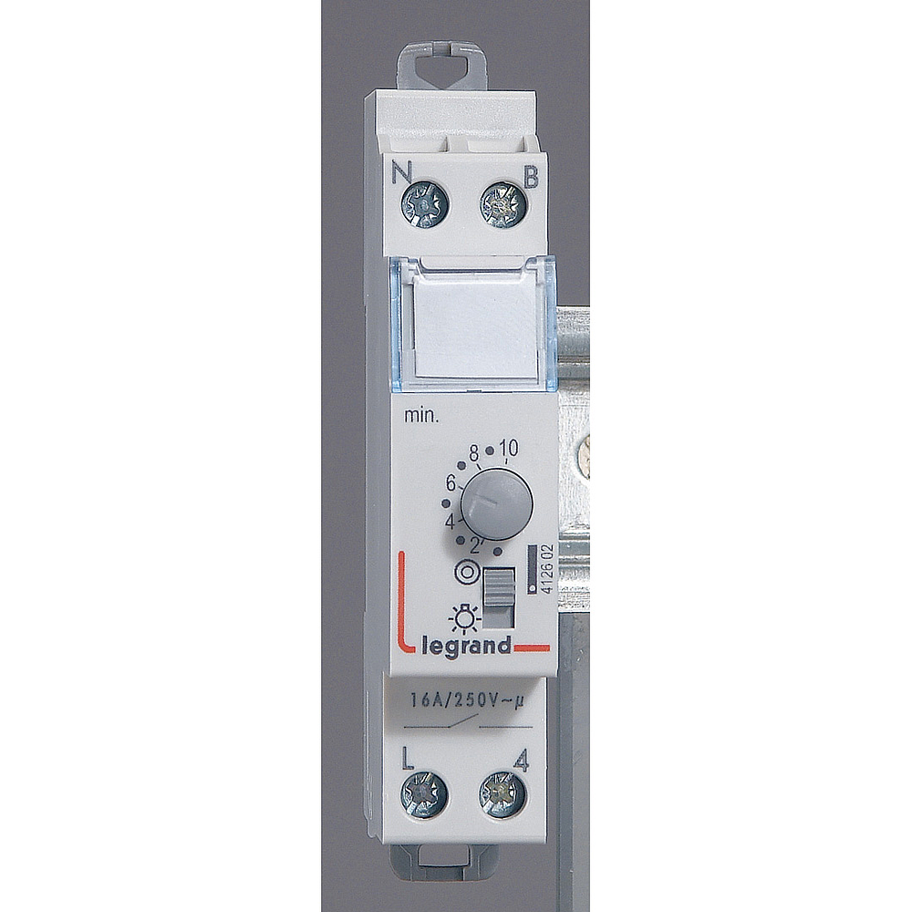 Minuterie modulaire 230V~ 50Hz et 60Hz avec 1 sortie 16A 250V~ avec temporisation réglable de 0,5 à 10 minutes - particulièrement adaptée aux lampes LED et fluocompactes - 1 module