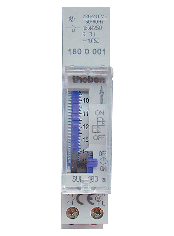 Interrupteur horaire mécanique modulaire. 3 Modules. Tension 230V avec réserve de marche. Programme 24 h. 1 contact 16A. Minimum de programmation 15 min.