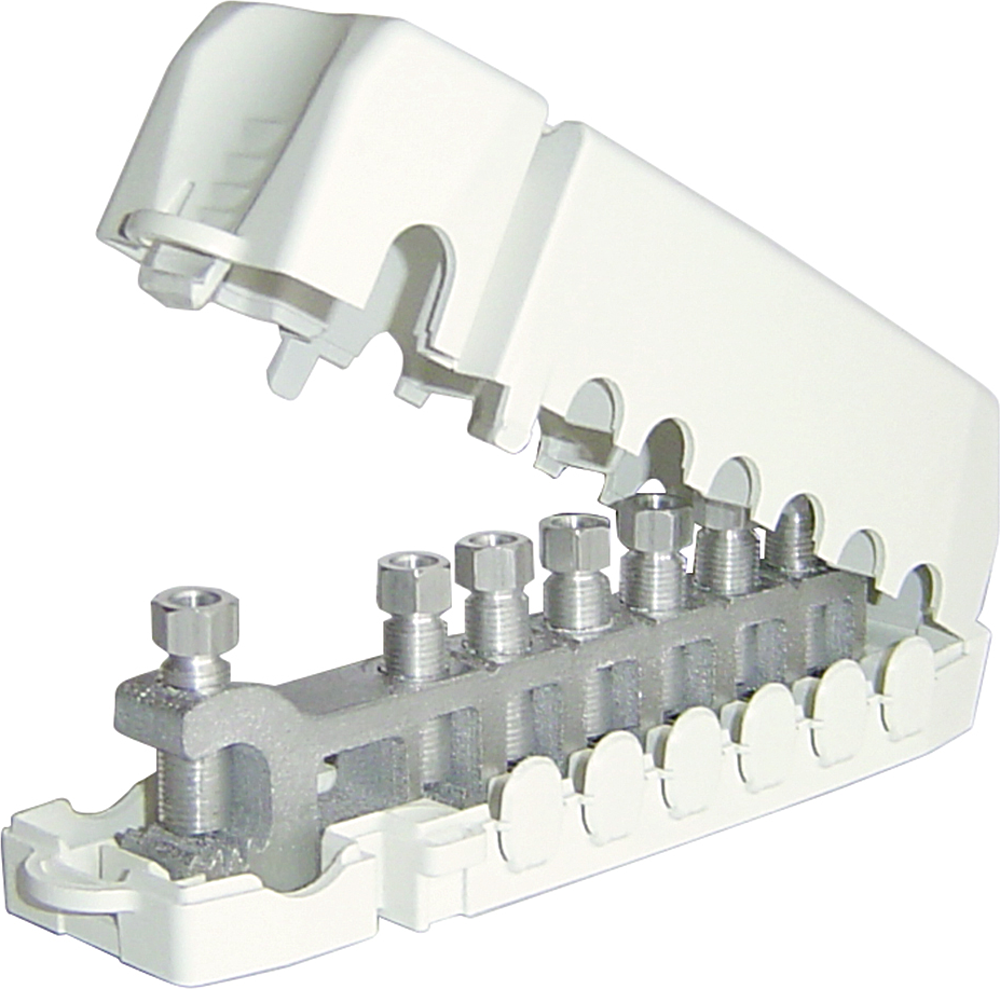 Répartiteur de terre. Conçu pour admettre 1 câble de 35 mm² maxi sans coupure, 4 départs clients 25 mm² maxi, 1 dérivation éventuelle 35 mm² maxi (ou 5 ème départ client).