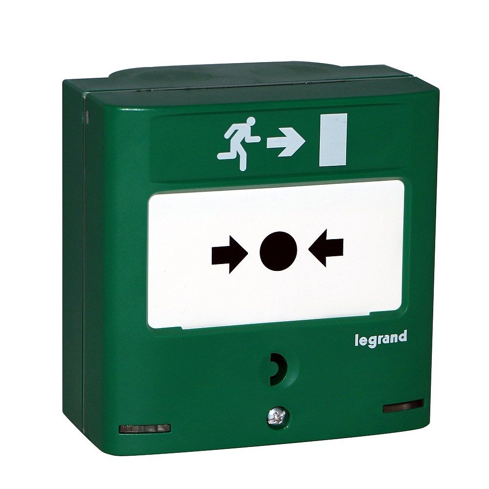 Dispositif de Commande Manuelle pour Issue de Secours (DCMIS) standard, équipé d’un contact O/F 5A 24V=, 1A sous 48V= - boîter vert pour fixation saillie ou encastrée IP30