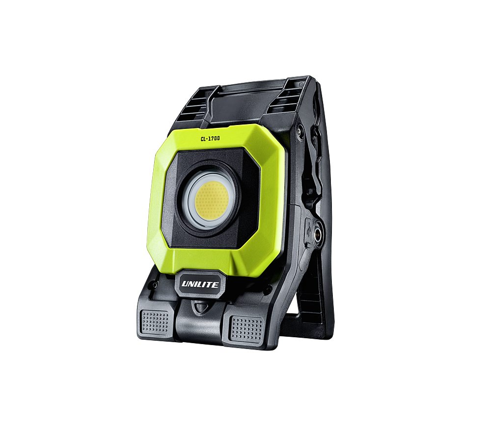 Lampe LED COB 1700 lm avec pince solide, base aimantée, tête orientable (270°/340°), autonomie 3–22 h, recharge USB-C rapide, mémoire de mode, indice IP65/IK07, batterie Li-ion 5200 mAh, câble inclus.
