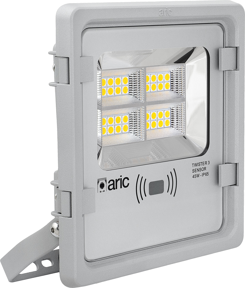 Projecteur extérieur TWISTER 3 LED IP65 IK08, gris (RAL 9006), faisceau symétrique 90° LED intégré 45W 3000K 4950lm IRC80, intérieur/extérieur, détecteur de mouvement Microwave réglable intégré, télécommande fournie
