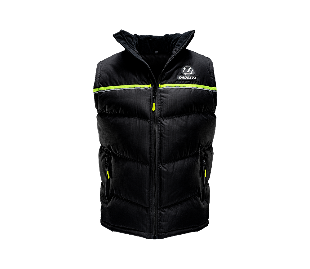 Gilet en polyester épais 100 %, bandes réfléchissantes avant/arrière, doublure polaire au cou, rembourrage chaud, doublure intérieure douce, fermeture YKK robuste, rabat coupe-vent, détails jaune fluo pour plus de sécurité.