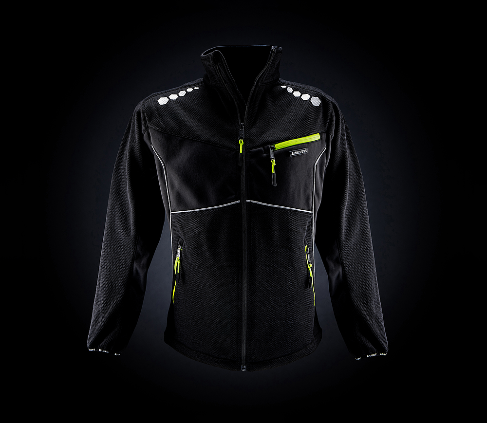 Sweat zippé noir épais 260 gsm en polyester, doublure polaire chaude, zips YKK inversés étanches, rabat coupe-vent, détails réfléchissants, zips jaunes haute visibilité, poignets élastiqués, confort et protection contre le froid.