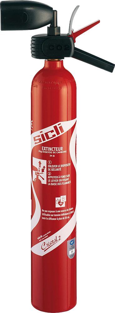 Extincteur à dioxyde de carbone CO2 pr feux d’origine électrique et des feux de liquides inflammables (type B). A utiliser jusqu’à 1 000 Volt AC et 1 500 Volt DC. Homologation 34B, Certification NF/EN3 N°EC2 594 108.