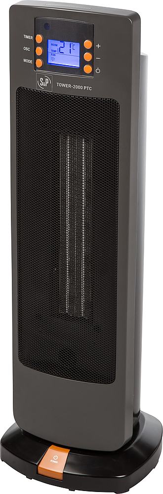 Radiateur soufflant, tour avec élément chauffant en céramique, puissance 2000 W, écran LCD, temporisation de 30 mn à 8h, contrôle électronique à distance, oscillation 80°, sécurité anti-basculement, commutateur sur pied, classe II