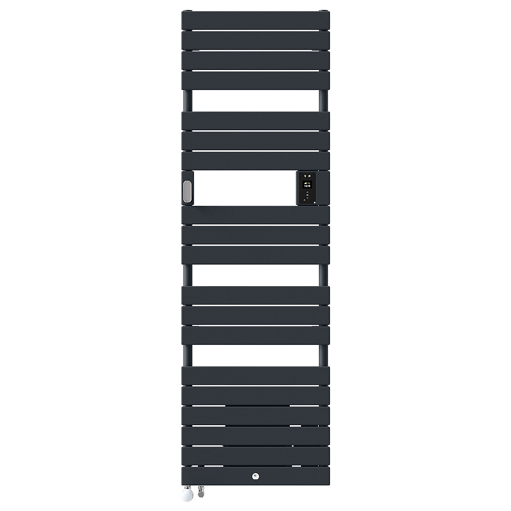 Le Radiateur sèche-serviettes Riviera 2 mixte 1750W Noir carbone chauffe rapidement grâce à sa soufflerie. Il est connecté et affiche la météo pour un confort optimal dans votre salle de bains, été comme hiver.