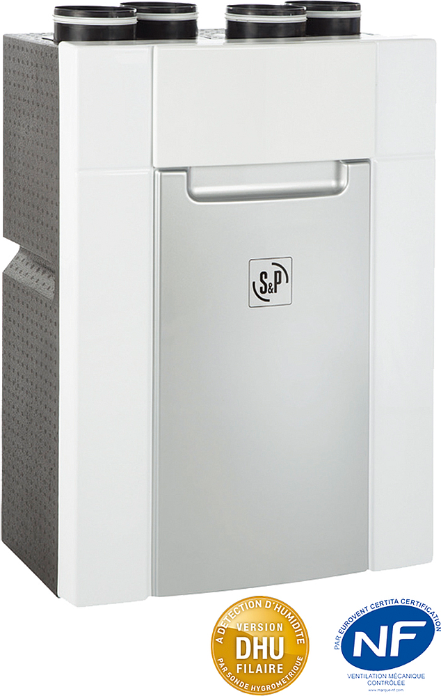 VMC double flux à Très Haut Rendement 88%, 210 m3/h, pilotable par commande filaire et sonde thermo-hygro proportionnelle gèrant les paramètres d'utilisation (Boost cuis. tempo, Mode abs, Alarme filtres), certifié NF, Bypass 100%. %VERSION% VMC dou