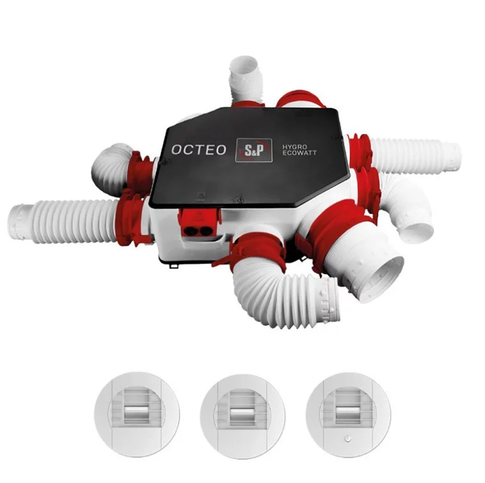 Kit VMC OCTEO HYGRO ECOWATT HP+ spécial Constructeurs de Maisons Individuelles (CMI) avec 3 bouches hygroréglables et 4 gaines isolées ECOSOFT (D80/125/160)