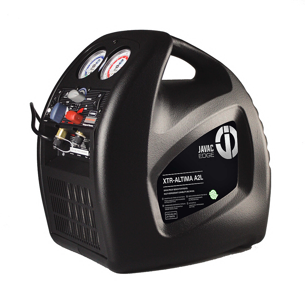 Station de récupération de fluides frigorigènes en phase liquide et phase vapeur. Conception anti-étincelles pour R32/A2L. Prise en charge de fluides frigorigènes multiples (dont R410A) condensateur haute capacité. Compresseur sans huile