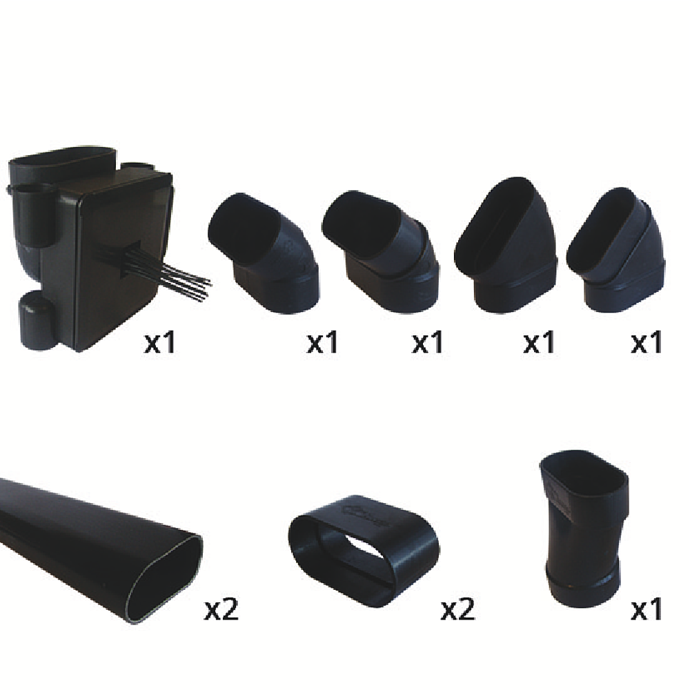 Kit d'installation pour système de flexible rétractable pour cloison sèche (prise d'aspiration, contre-prise, conduits d'aspiration, coudes 90°, coudes 45°, coudes 22,5°, manchons, colliers, poingée, flexible)