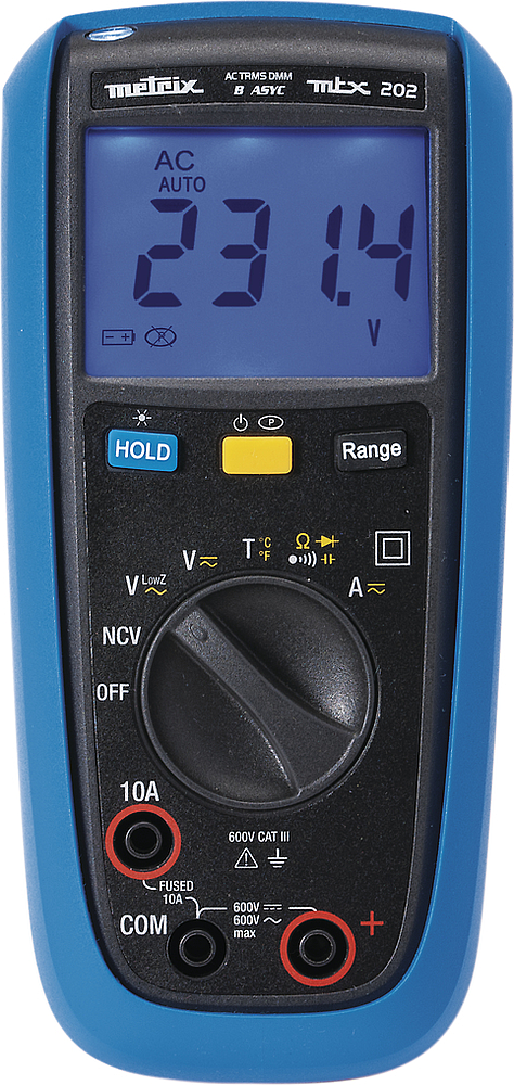 MTX 202 Multimètre TRMS AC 4000 pts avec rétroéclairage. Tension et courant AC-DC - Résistance - Continuité - Test diode - Température - Capacité - Position basse impédance en tension AC - Détection tension sans contact - 600V CAT III