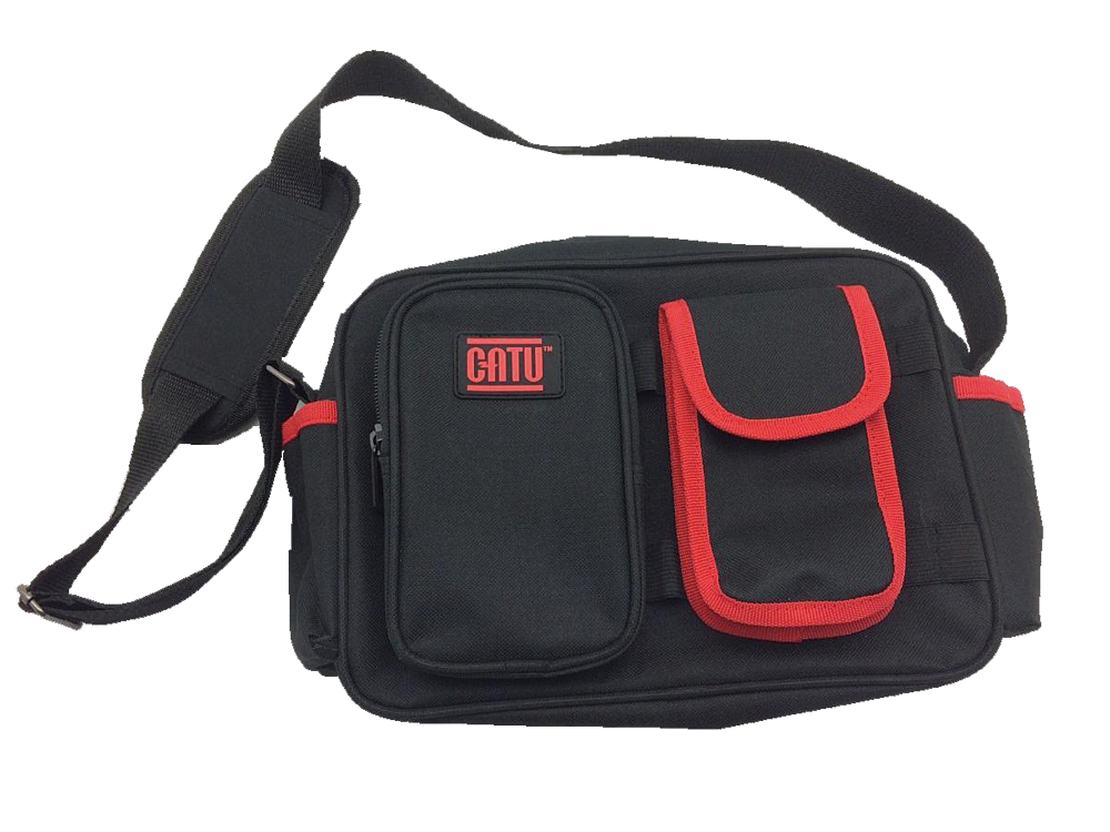 Sacoche pour matériel d'électricien. Tissu noir - liserés rouge - 1 bande rétroréfléchissante. Fond renforcé. Sangle ajustable avec épaulière. Dimensions