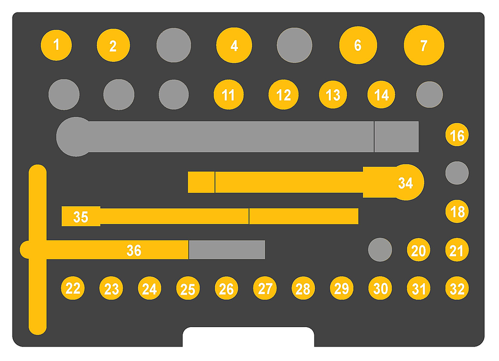 KIT outils isolés. 18 Douilles 6 pans femelles 3/8: 6-7-8-9-10-11-12-13-14-15-16-17-18-19-21-22-23-24, 5 douilles mâles 6 pans 3/8: 4-5-6-7-8, clé en T", clé à cliquet, rallonge. Conforme IEC 60900. Umax = 1000 V a.c. - 1500 V d.c.
