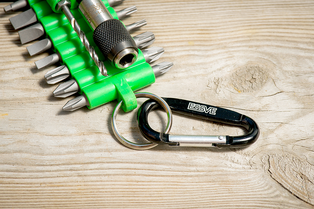 Présentoir prêt à vendre contenant 25 kits embouts avec mousquetons. Chaque kit contient 16 embouts (PH, PZ, TP, Fente, Carré), 2 douilles (8mm et 1/4), 1 porte-embout magnétique avec bague de verrouillage et 1 foret n°3