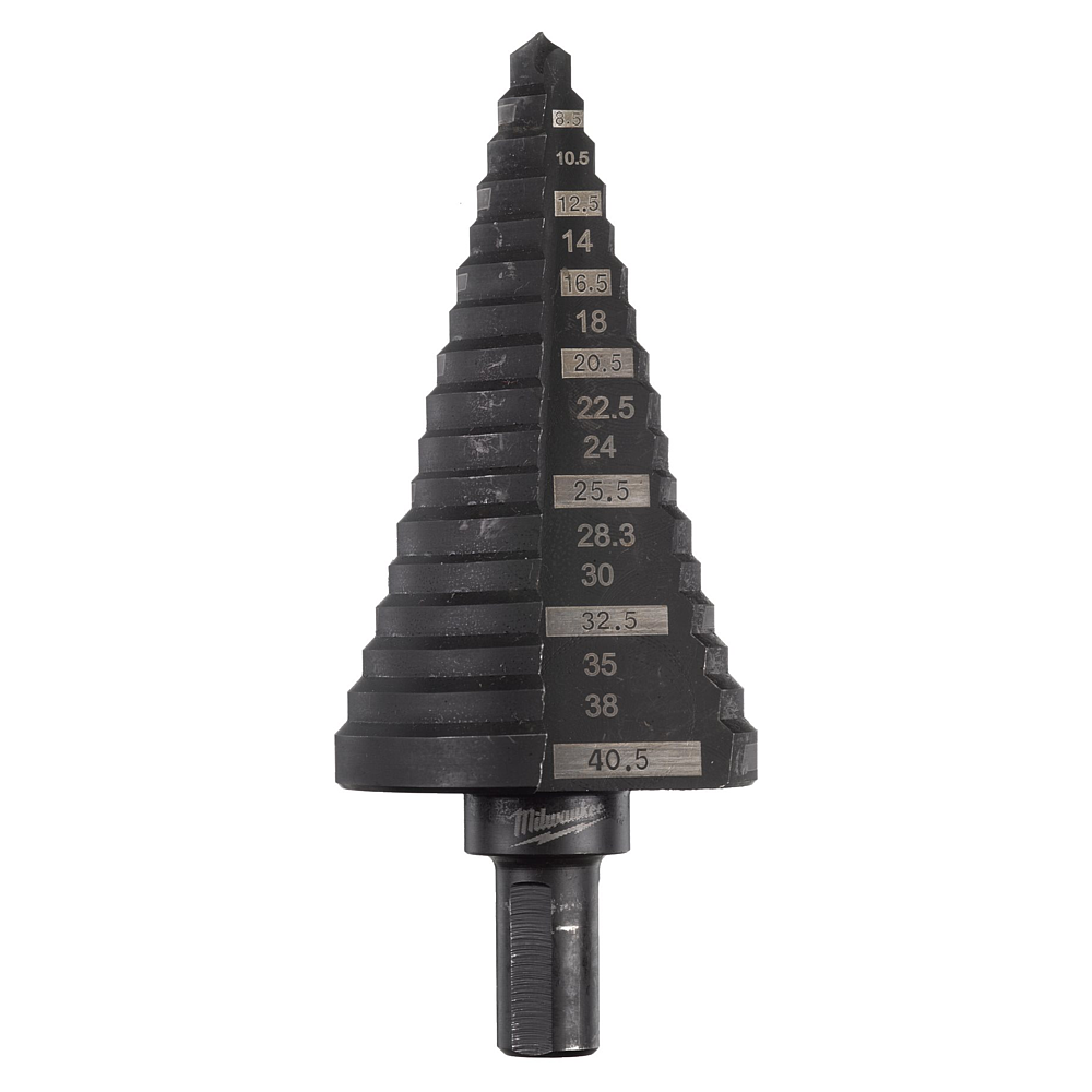 Foret étagés Polydiam, cotes métriques à finition HSS. Perçage 5 - 7,5 - 10 - 13 - 16 - 19 - 21 - 23 - 29 - 31 - 33 - 35 mm, dans l'acier épaisseur 3,7 mm max.