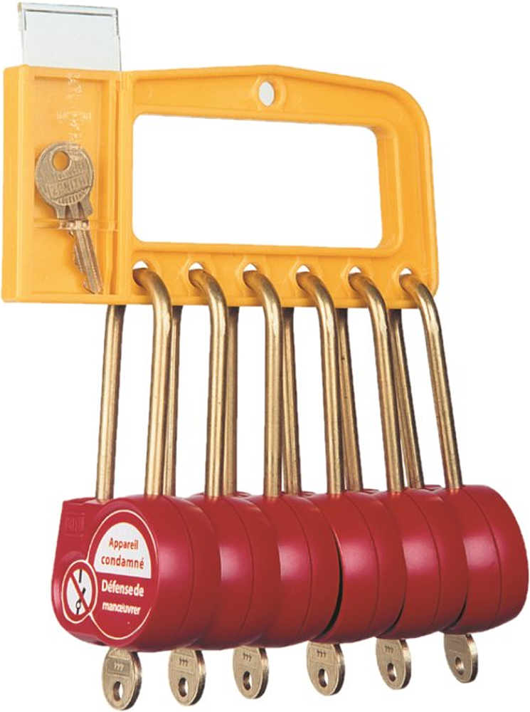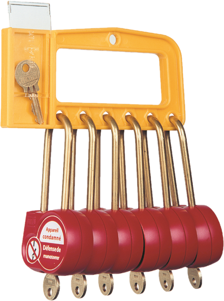 Poignée de consignation. Permet de transporter jusqu'à 12 cadenas. Porte-clés intégré. Peut se porter à la ceinture. Livrée sans cadenas.