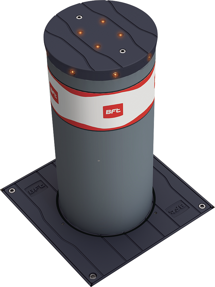 Borne escamotable de dissuasion électromécanique avec caisson de coffrage, avec fût de 490 mm de hauteur et 219 mm de diamètre. Résistance aux chocs 10500 J. Couleur RAL sur demande.