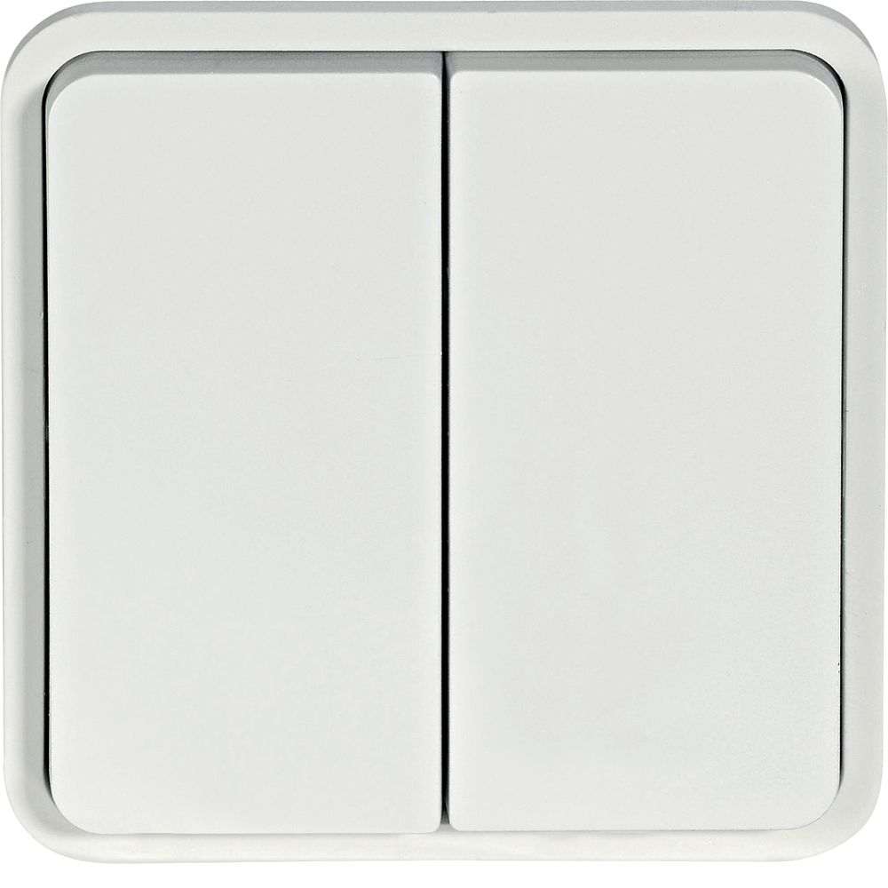 Mécanisme associable de double interrupteur va et vient IP55. Coloris blanc, se monte dans une boite en saillie ou dans un support encastré cubyko.