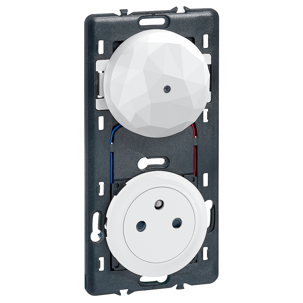 Interrupteur connecté dooxie blanc, sans neutre, 200W. Contrôle via l'App Home + Control et les assistants vocaux. LED, Zigbee. Installation encastrée, voyant lumineux, entrée auxiliaire. Nécessite passerelle Netatmo