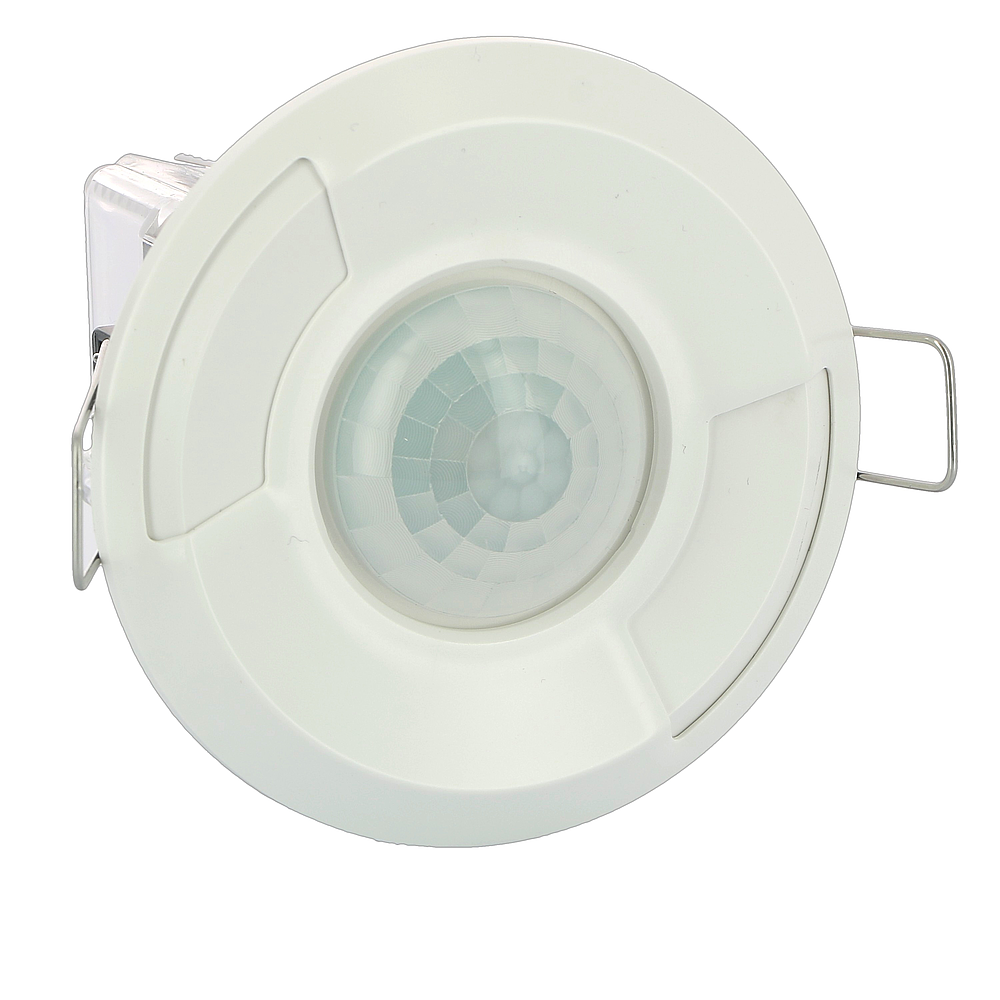 GREEN-I Détecteur blanc ON/OFF pour la gestion de l'éclairage. Montage plafond encastré, 360° sur 14m. Bague coulissante brevetée pour protéger les potentiomètres gradués, câblage rapide et double configuration.