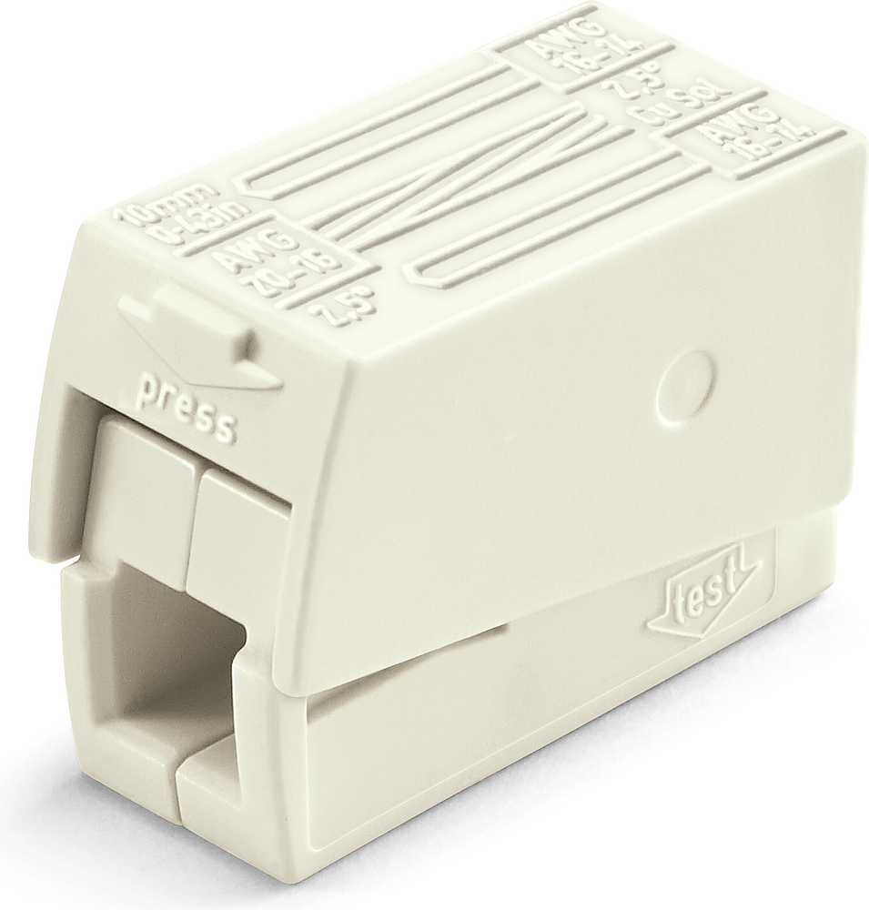 Borne p.luminaires/convecteurs 2,5 mm² 2 rigide - 1 souple. 24 A. 400 V. Conforme à la C15-100, résistant au test au fil incandescent 960 °C. %VERSION% Borne pour luminaires pour 2 conducteurs; Bouton-poussoir côté luminaire; côté luminaire