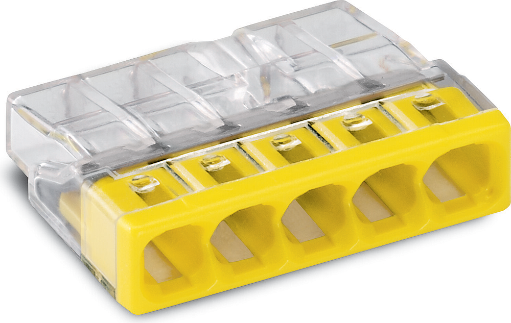 Nouvelle borne WAGO 2273 5x0,5-2,5mm² pour fil rigide TRANSP/JAUNE. 24 A - 450 V - CE - 960°. Conforme à la C15-100. %VERSION% Les connexions de la série 2273 acceptent des fils rigides. De 0,5 mm² à 2,5mm² et support jusqu'à 24A. Elles sont les