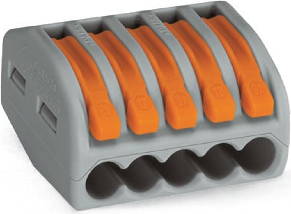 Nouvelle borne WAGO 2273 8x0,5-2,5mm² pour fil rigide TRANSP/GRISE.24 A - 450 V - CE - 960°. Conforme à la C15-100. %VERSION% Les connexions de la série 2273 acceptent des fils rigides. De 0,5 mm² à 2,5 mm² et support jusqu'à 24A. Elles sont les