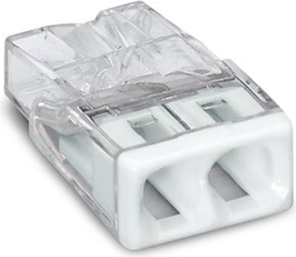 Nouvelle borne WAGO 2273 2 x 0,5-2,5 mm² pour fil rigide TRANSP/BLANCHE. 24 A - 450 V - CE - 960° - Conforme à la C15-100. %VERSION% Les connexions de la série 2273 acceptent et permettent de raccorde des fils rigides de 0,5 mm² à 2,5mm² et suppo