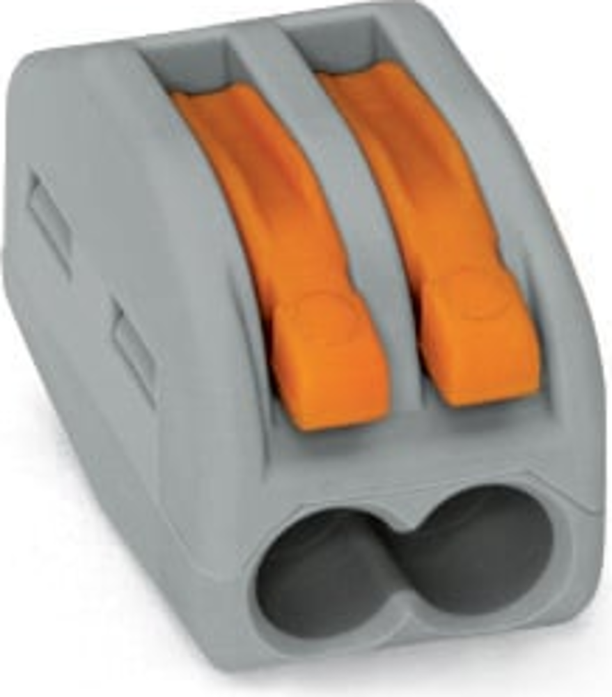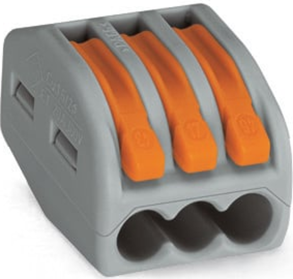 Borne de connexion 3 x 2,5 mm rigide / 4 mm² souple. 32 A. Gris. Conforme à la C15-100, résistant au test au fil incandescent 960 °C. %VERSION% Les connexions de la série 222 acceptent des fils souples ou rigides. Jusqu'à 2,5mm² en rigide et 4mm