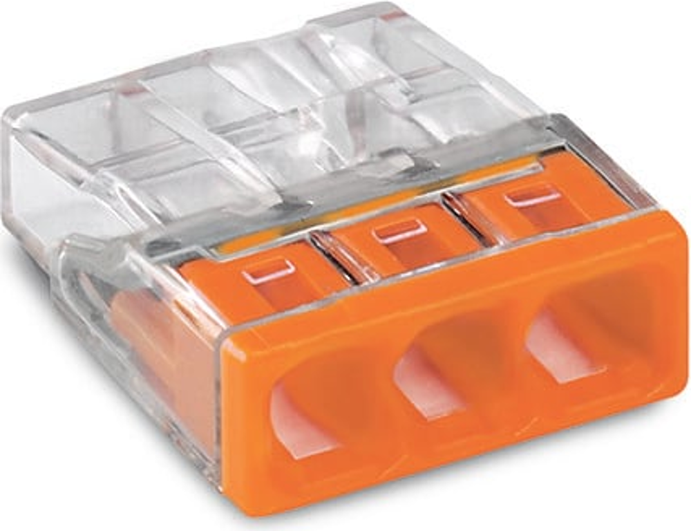 Nouvelle borne WAGO 2273 3x0,5-2,5mm² pour fil rigide TRANSP/ORANGE. 24 A - 450 V - CE - 960°. Conforme à la C15-100. %VERSION% Les connexions de la série 2273 acceptent des fils rigides. De 0,5 mm² à 2,5mm² et support jusqu'à 24A. Elles sont le