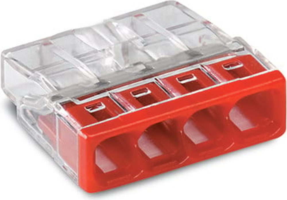 Nouvelle borne WAGO 2273 4x0,5-2,5mm² pour fil rigide TRANSP/ROUGE.24 A - 450 V - CE - 960°. Conforme à la C15-100. %VERSION% Les connexions de la série 2273 acceptent des fils rigides. De 0,5 mm² à 2,5mm² et support jusqu'à 24A. Elles sont les