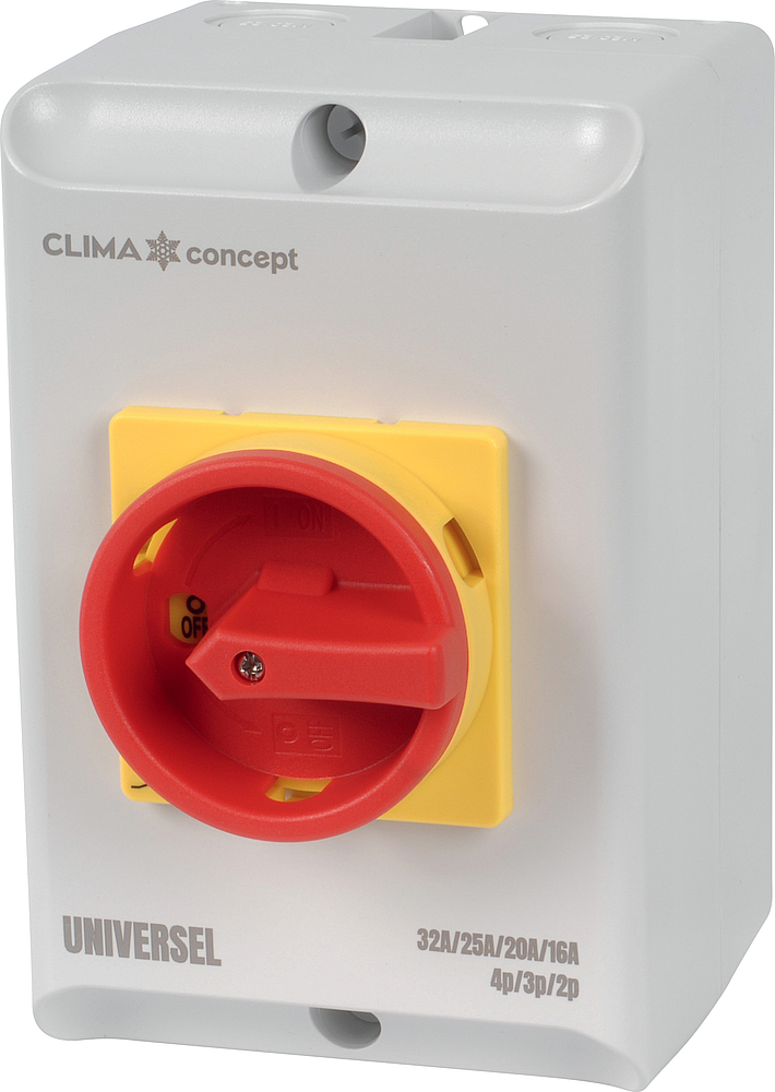 CLIMACONCEPT – Interrupteur proxi universel L 32/25/20/16 A, 2/3/4 P, dimensions 176×116×136 mm, boîtier IP65. Tout-en-un, livré avec 2 presse-étoupes M20 + 2 M25. Facile à installer, cadenassable OFF, conforme EN 60947-3.